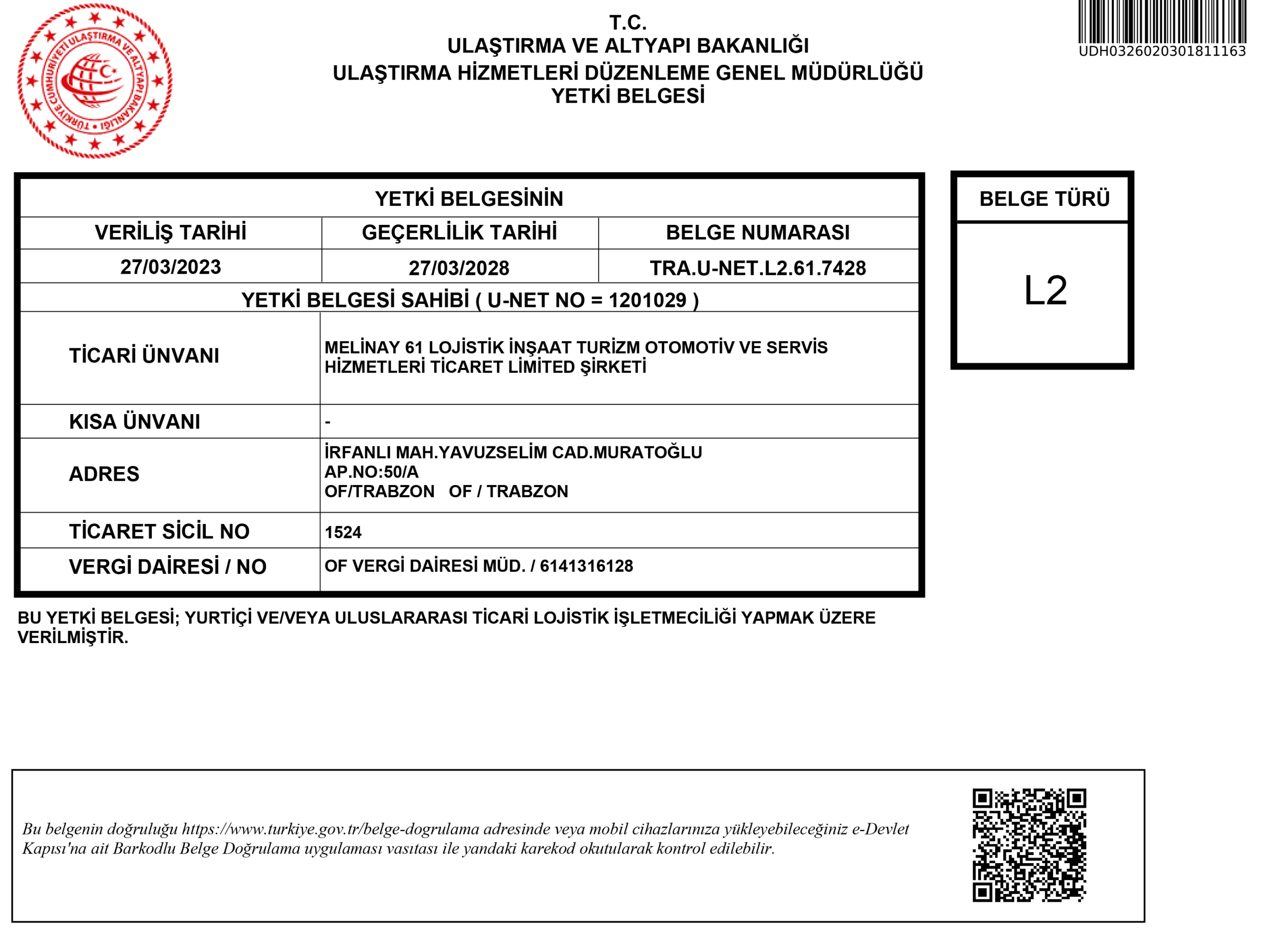 L2 Yetki Belgesi – Yurtiçi Lojistik Hizmetler
